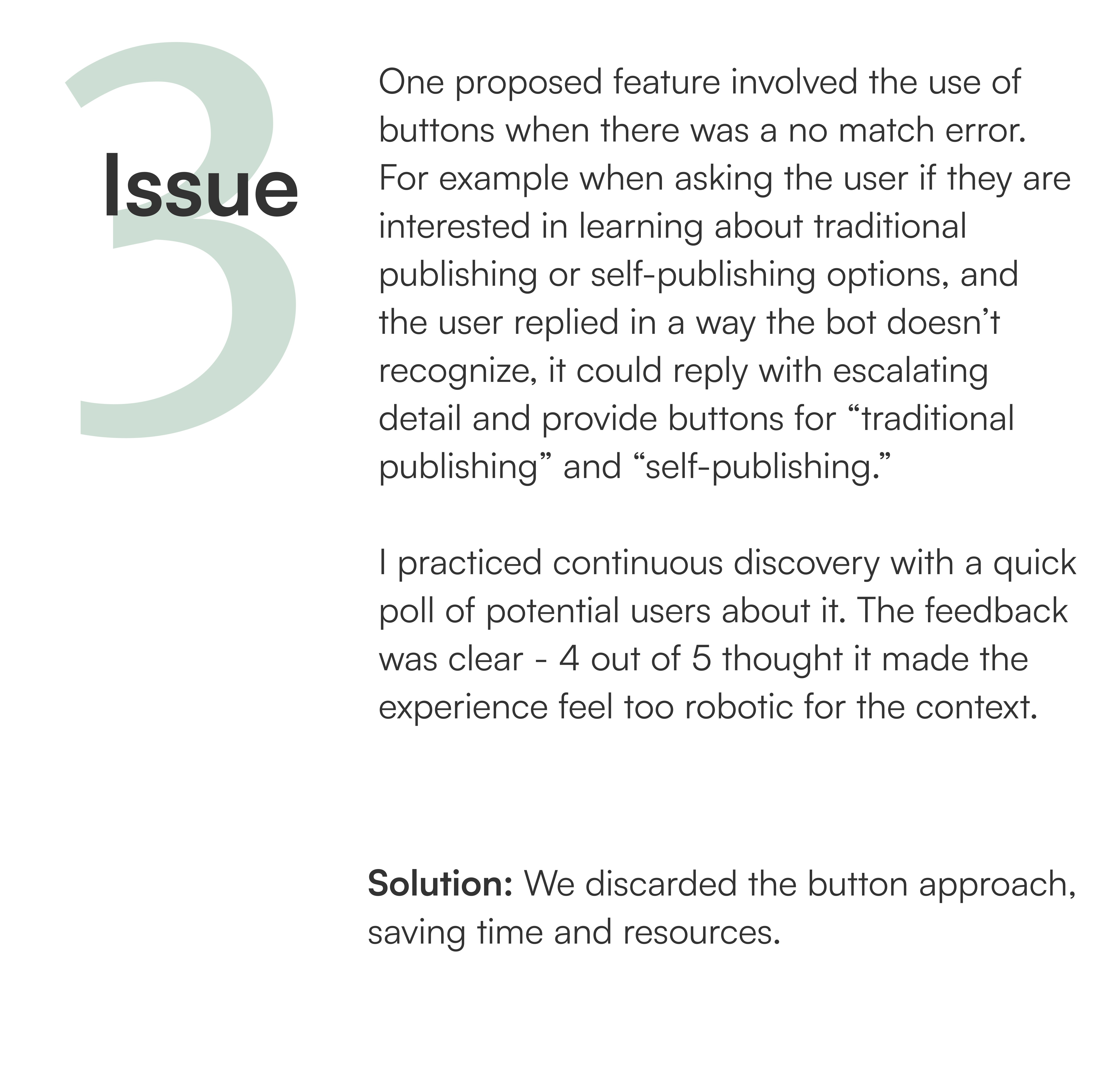 The obligation is on the user to know what to ask, but new authors don’t know the things that they don’t know. With a designed conversation, however, the bot can guide the user to the most helpful information.