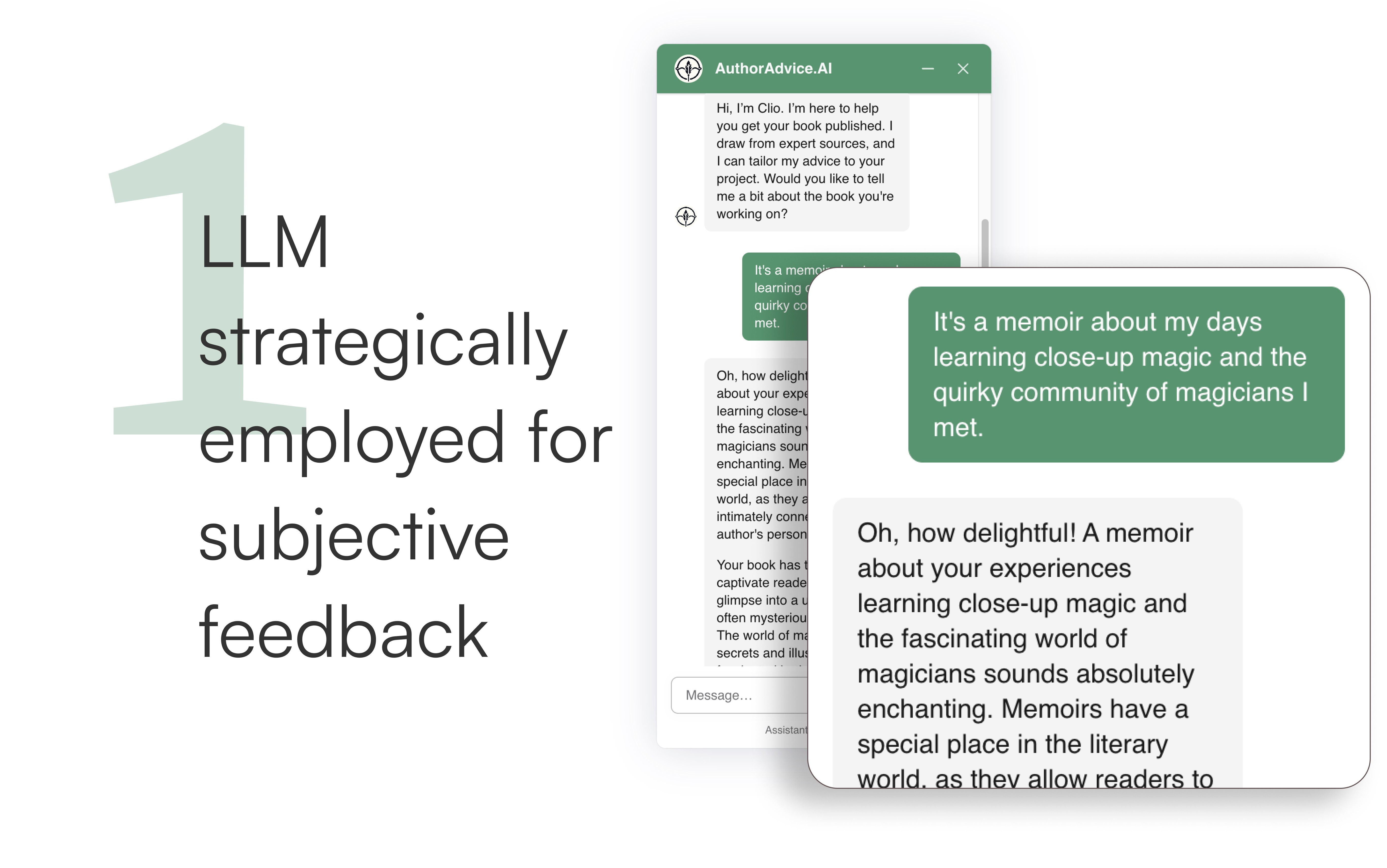 Designing a conversation that focuses on accepted wisdom for general advice, while strategically using LLMs to provide more subjective feedback on things like the author’s elevator pitch.