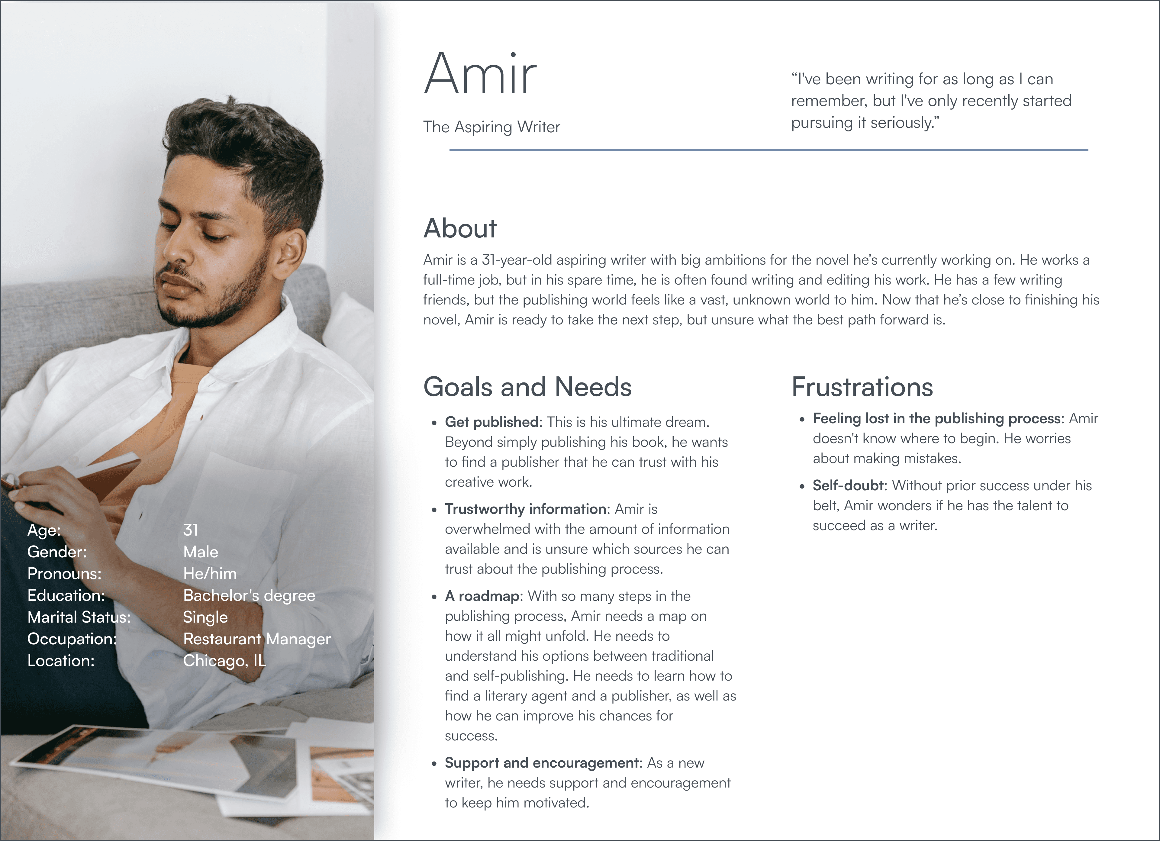 Because the user interviews resulted in a MVP focus on the early stages of publishing, the persona created for this stage is for an aspiring writer.