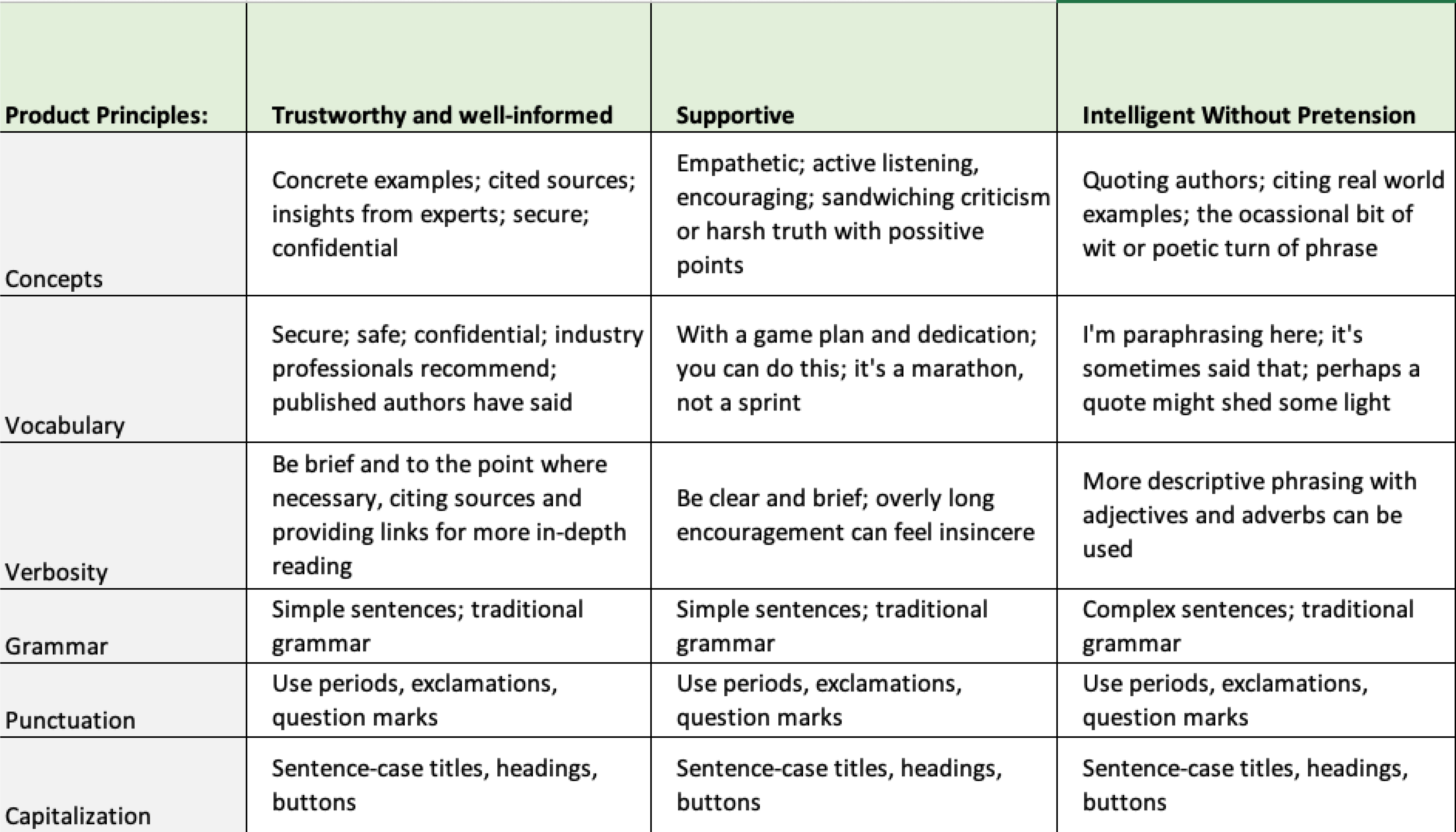 Instead, the goal with the voice design is to break up advice into digestible bits.