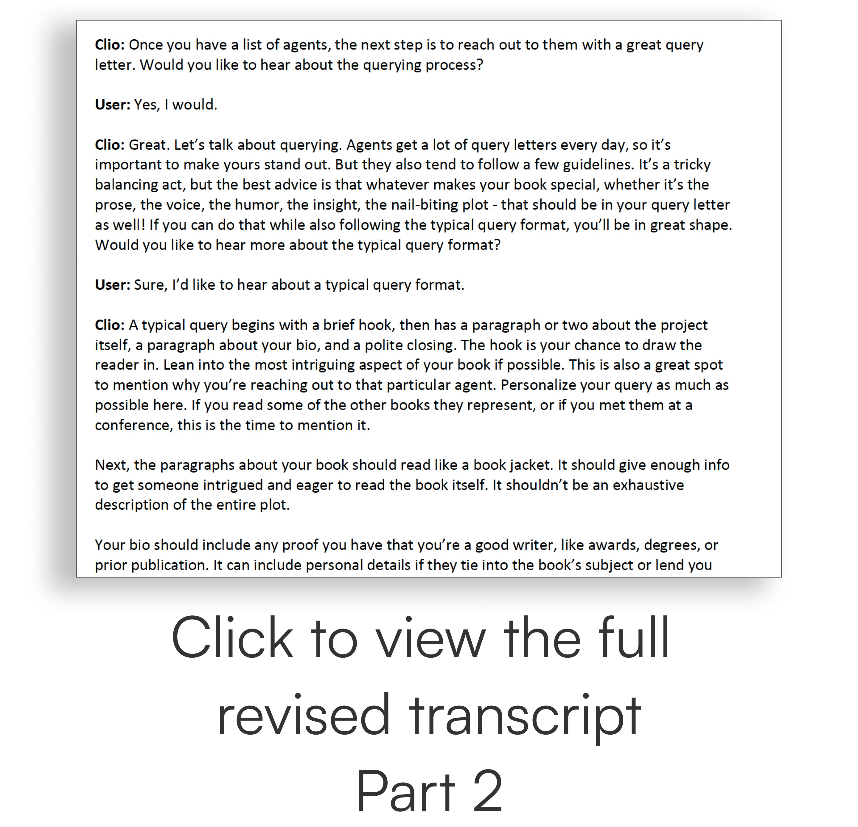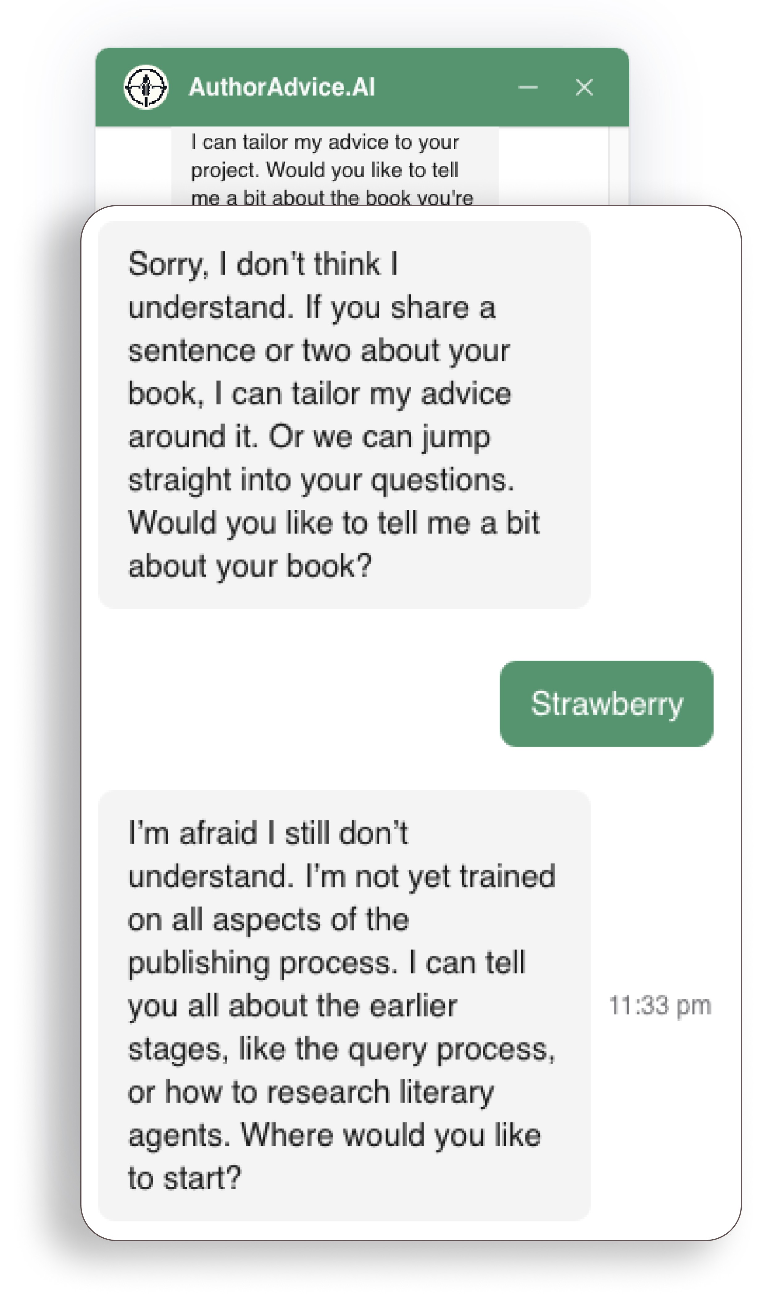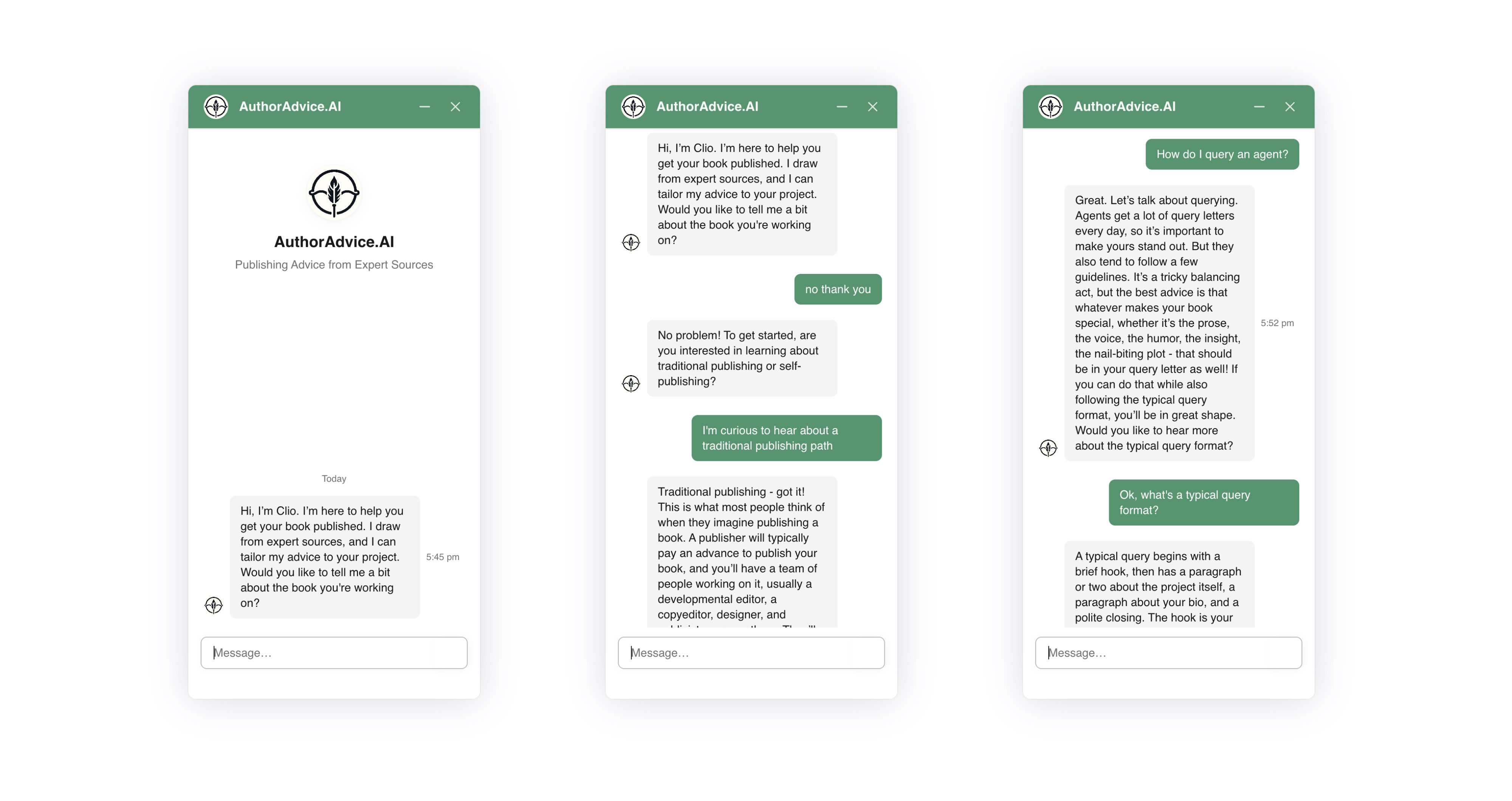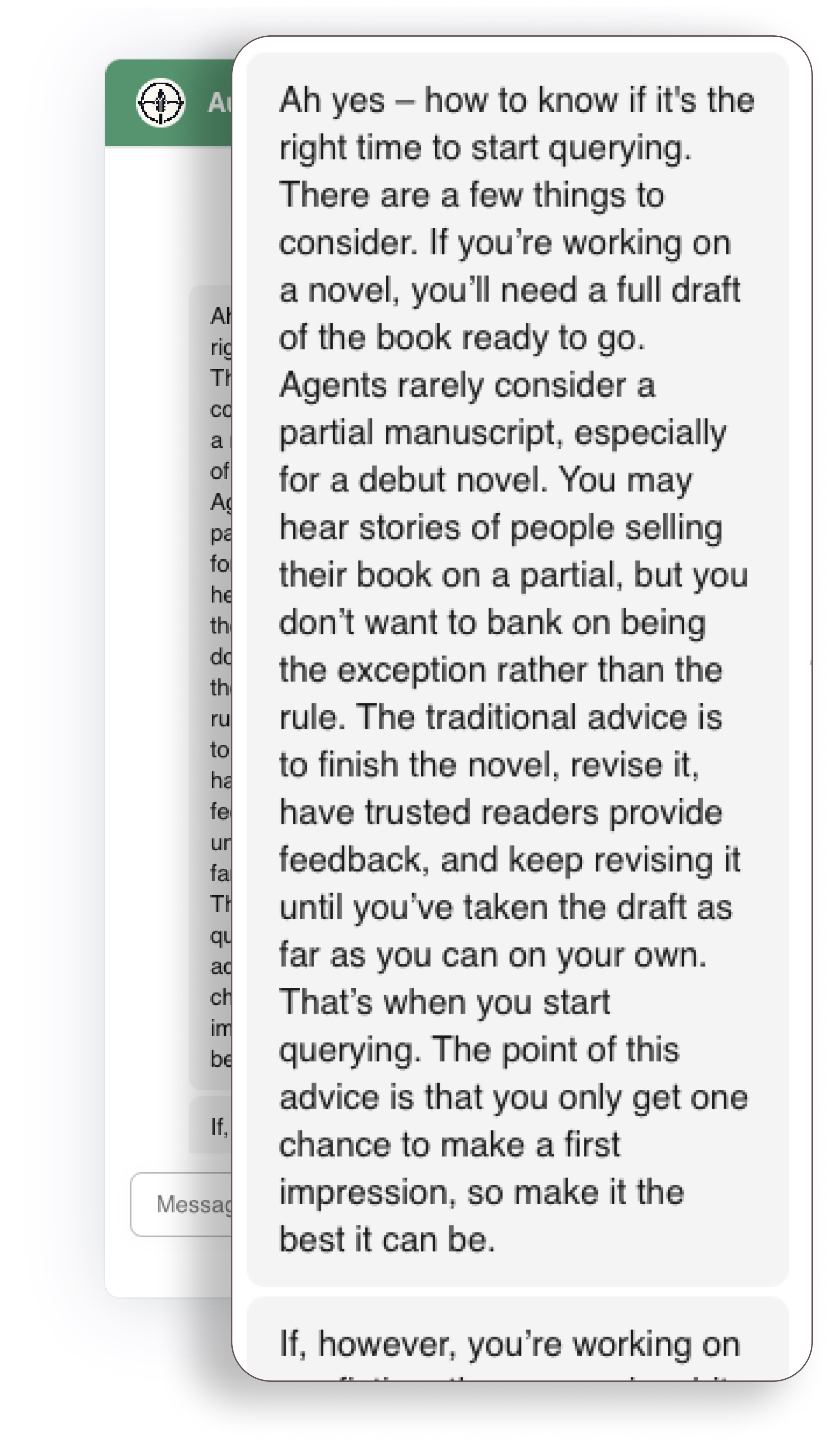 AuthorAdvice.AI bot’s advice will naturally be complex, given the subject matter. Users will have an easier time following along if they can read through a response at their own speed, and more than once if necessary.