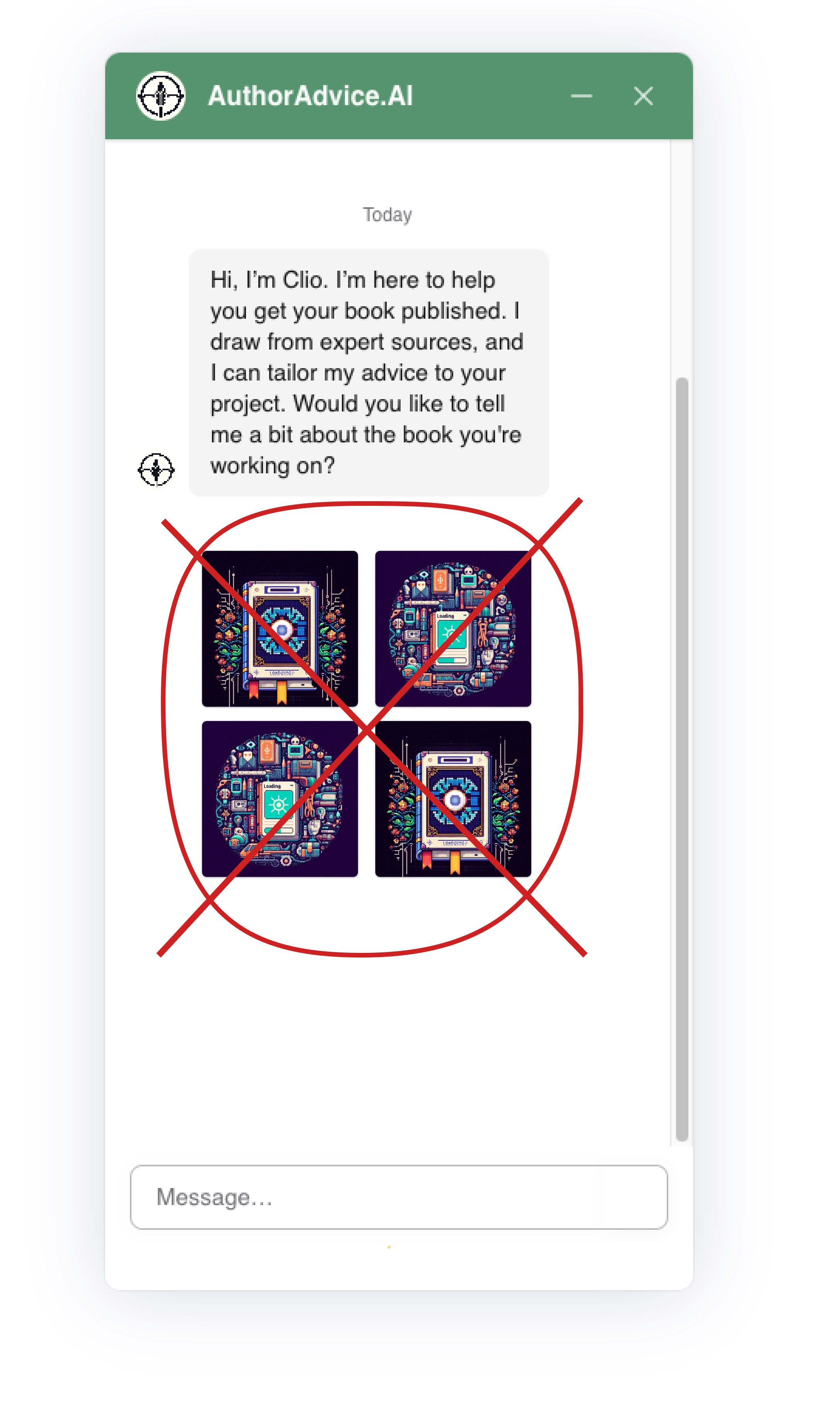 AI Cover Art Generator: The user could be prompted to provide a description of their work, the title, and the author’s name, and the AuthorAdvice.AI bot would generate cover art based on it. The image could be used as a motivating tool, telling the user “Picture this! You can get there!”