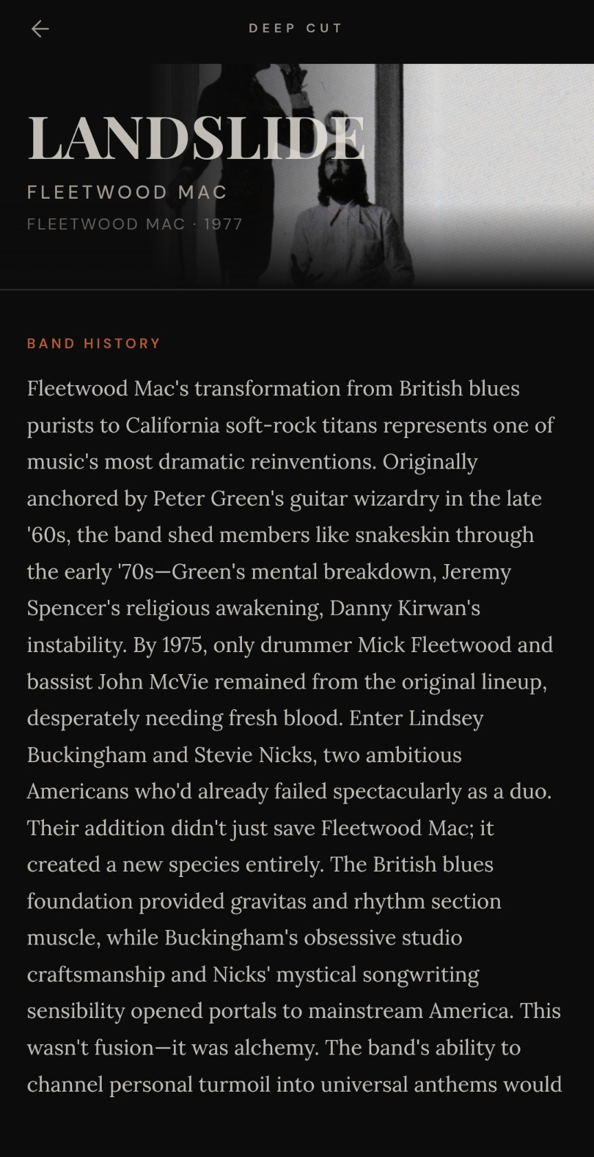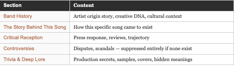 The premise is simple: let your phone listen to a song playing in the room, and receive a behind the scenes editorial on the artist and that specific track: band history, the story behind the song, critical reception, controversies, trivia, and deep lore. The kind of insights that makes you feel like you know something now that you didn't before.