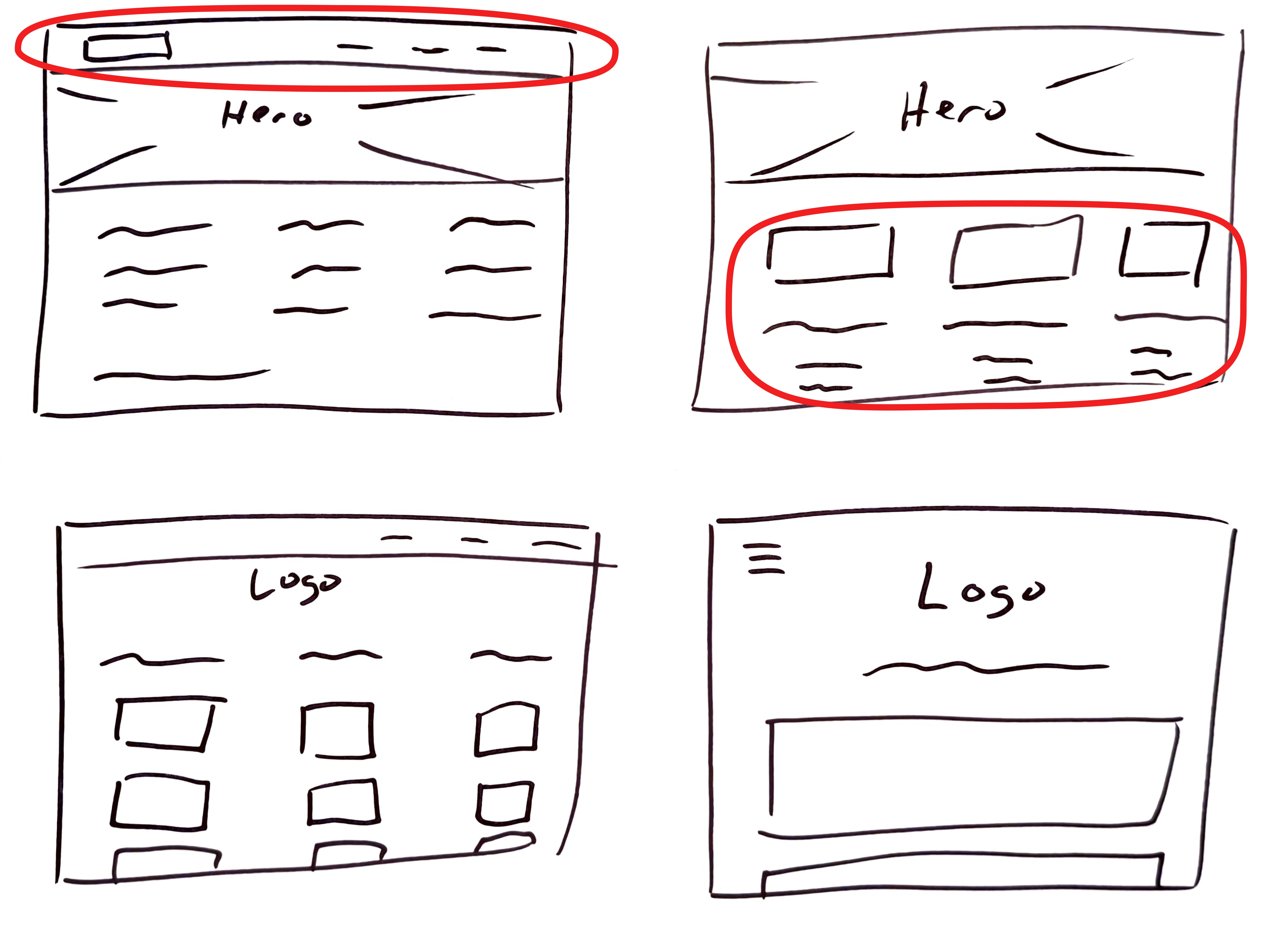 I ended up going with a blend of the top left two options here. The navigation from the first one, with the three column format that is topped with large images from the second.